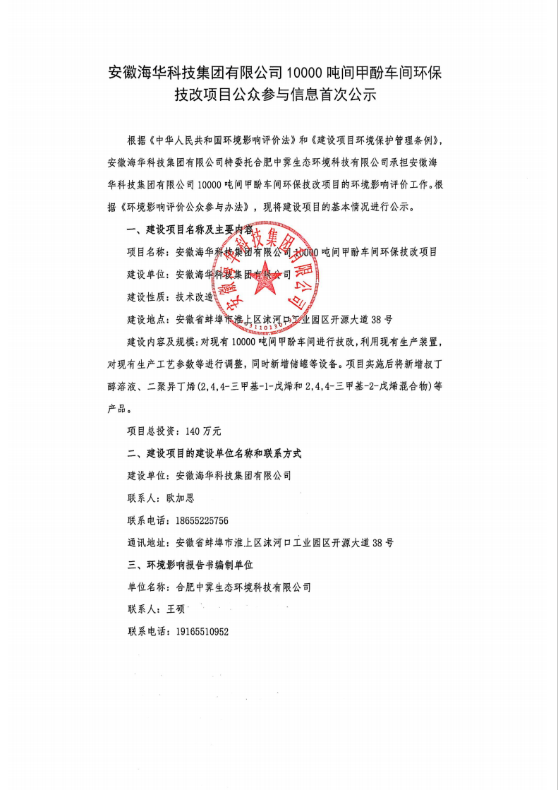 公示 | 安徽海华科技集团有限公司10000吨间甲酚车间环保技改项目公众参与信息首次公示