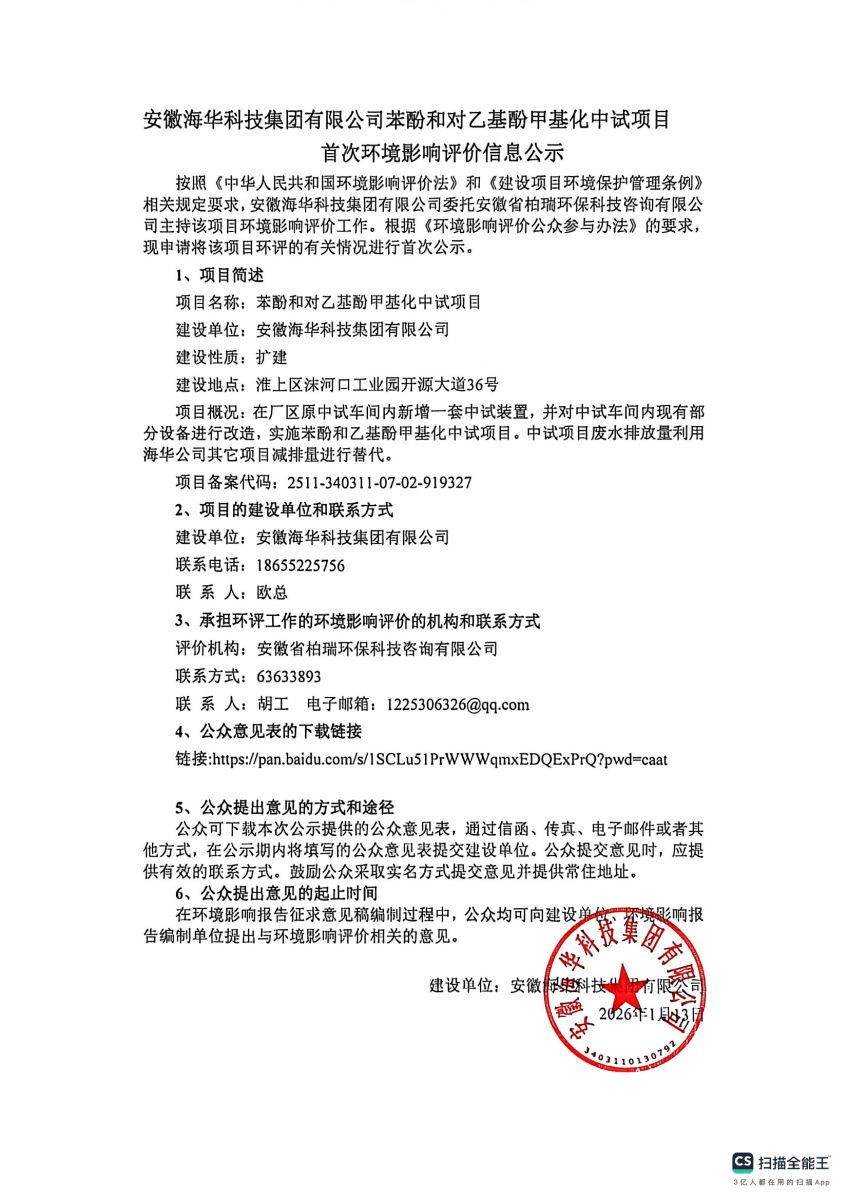 公示 安徽海华科技集团有限公司苯酚和对乙基酚甲基化中试项目首次环境影响评价信息公示